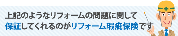 このような瑕疵が発生しないように、また最悪発生してしまった場合でも皆さんが依頼したリフォーム内容について保証してくれるのがリフォーム瑕疵(かし)保険です。