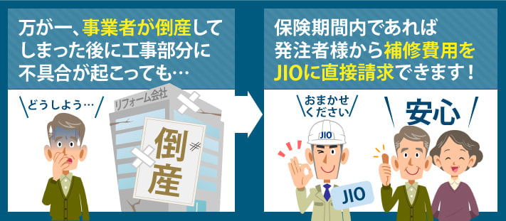工事に瑕疵が見つかった場合、第三者の検査員が証明することで保険法人に直接請求することができます。また依頼したリフォーム会社が倒産後、施工内容の瑕疵によって不具合が生じてしまってもお客様が保険会社に対して瑕疵部分の修繕費用を請求することが出来ます。これはリフォームの内容に関わらずリフォームを行う全部分が対象です。契約した工事内容の範囲内であれば全て請求することが可能なのです。