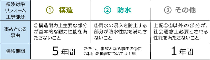 保険期間は対象部分によって変わりますので、あらかじめ保証内容をご確認ください。リフォーム瑕疵保険は、お客様からご依頼いただいた案件ごとに、工事着工前のお申し込みが必要です。