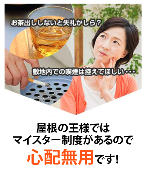 屋根の王様では「お客様なのですからお気遣いやご遠慮なさらず、気になったことは何でもおっしゃってください」と申し上げております。日本人の美徳と申したらよいのでしょうか、それでもお気遣いなさる方が多いのです。