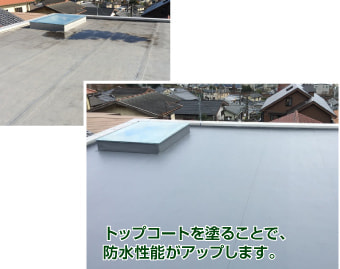陸屋根・屋上・ベランダなども表面の防水性能が落ちてきています。トップコートを塗り直す時期です。
