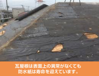 瓦屋根は表面上、何ともないように見えることがほとんどですが、その下の防水紙の寿命を越えています。横殴りの雨などでは雨漏りするようになるでしょう。屋根葺き替えか屋根葺き直しが必要です。